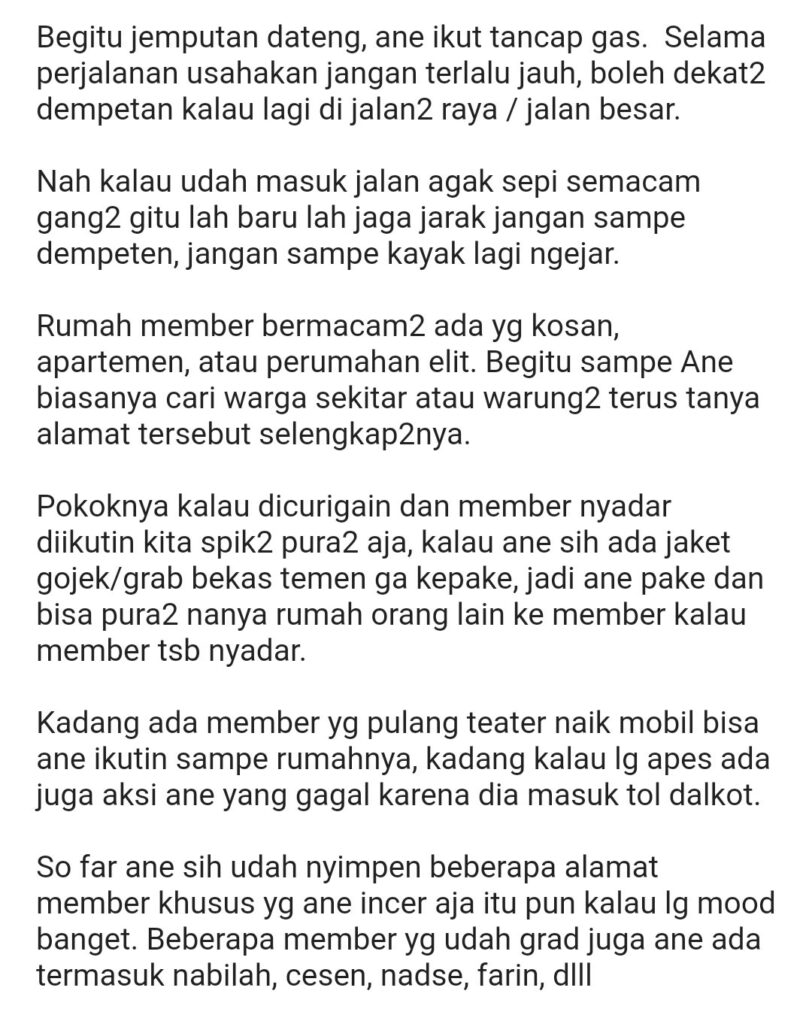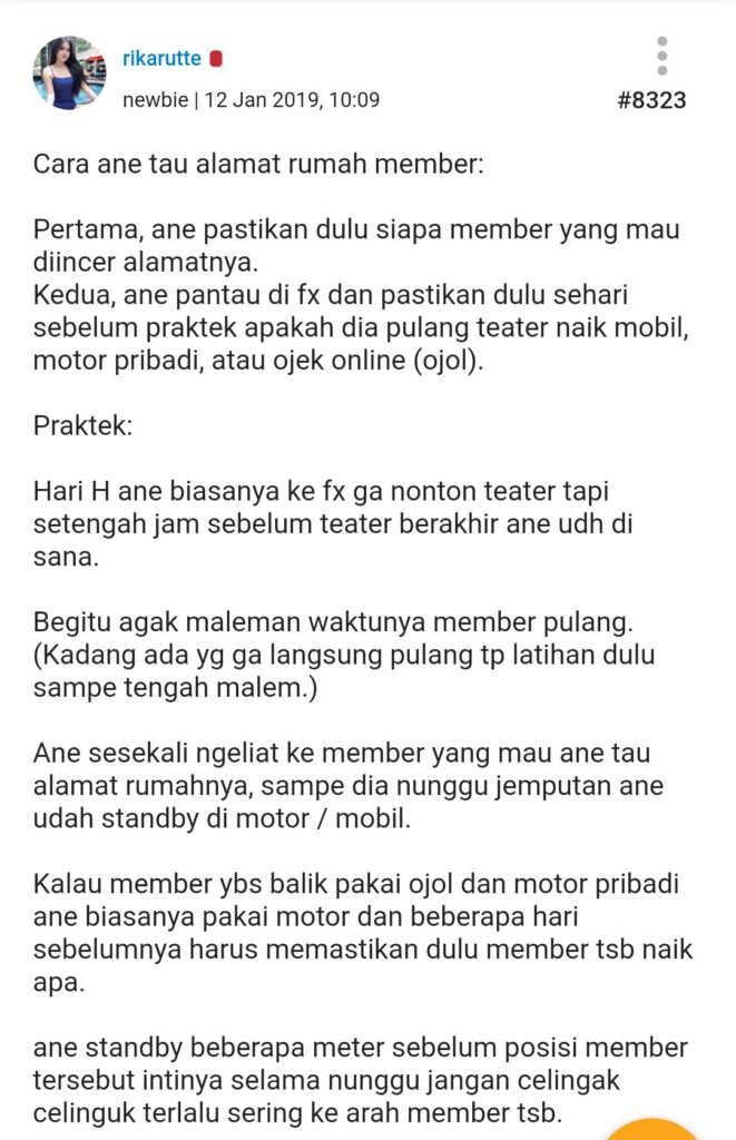 Di sisi lain, ada sebuah postingan Kaskus di tahun 2019 yang mengaku memiliki alamat tempat tinggal member JKT48. Dia bahkan menjelaskan proses pencarian alamat member dengan cara menguntit kendaraan yang digunakan setelah pulang latihan dari teater di fX Sudirman. Salah satu metode tersebut sepertinya berhasil diterapkan oleh pelaku stalker Shani di cerita sebelumnya.