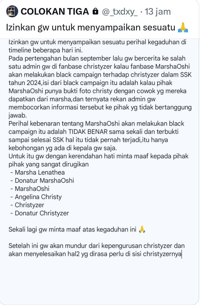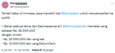 Selain itu, ada juga penggelapan dana fanbase Delynn. Hal ini dimulai dari sebuah cuitan clickbait yang memicu perbincangan baru, hingga akhirnya diungkapkan salah satu pengurus yang menyampaikan secara publik terhadap isu yang menjadi bola panas di akhir bulan Januari tersebut.