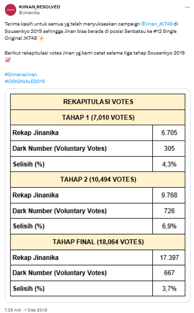 Sebenarnya, penerapan laporan hasil vote ini sudah ada di SSK sebelumnya, namun kebanyakan hanya menyampaikan detail vote masuk dan untracked votes saja tanpa diketahui detail terkait sumber dana, vote, dll. Contohnya di SSK 2019, fanbase Jinan (Jinanika) menyampaikan rekapitulasi suara yang telah dikumpulkan fanbase dan suara dari luar perhitungan fanbase yang disebut sebagai dark number. Terlihat bahwa terdapat 3,7% jumlah votes yang terlacak oleh fanbase.