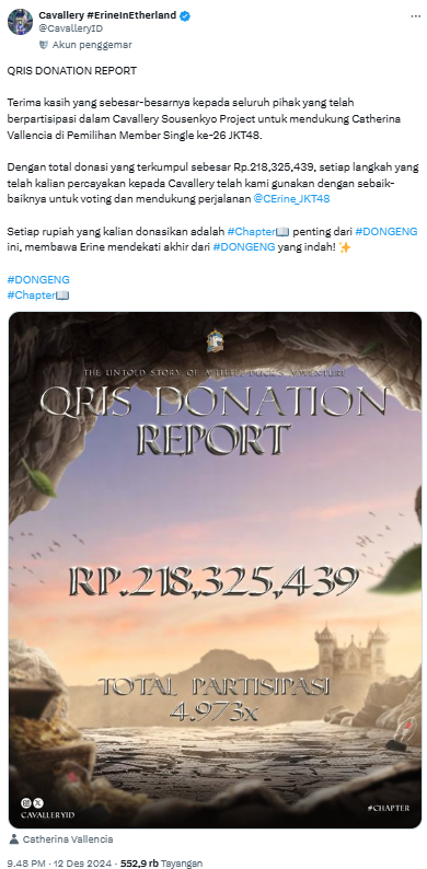 Saat artikel ini ditulis, Jessination, fanbase dari Jessica Chandra, telah mengumumkan laporan pertanggungjawaban atas pendapatan vote dan penggunaan dana. Tercatat pemasukan dari crowdfunding berbasis QRIS mencapai Rp25.163.000,00. Angka tersebut meng-cover 17% pemasukan keuangan SSK mereka. Pemasukan terbesarnya berasal dari donasi yang mencapai Rp61.400.000,00. Sedangkan pendapatan lain didapatkan dari tabungan yang dimulai sejak bulan Mei 2024, saldo kas, dan hasil penjualan merchandise serta gift dari live streaming di Tiktok.
