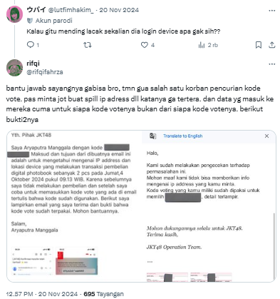 Selain itu, pada SSK 2024 ini terdapat isu pencurian kode vote. Dua tahun belakangan, fenomena joki war tiket meet and greet atau video call cukup marak seiring traffic website yang makin padat dan performa website yang buruk. Untuk pembelian tiket tersebut, penjoki akan mendapatkan akses akun dimana pelanggan akan memberikan informasi akses akunnya berupa e-mail dan password. Celah keamanan inilah yang dimanfaatkan oleh penjoki nakal untuk mencuri kode vote yang dapat diakses dari kuitansi pembelian produk.